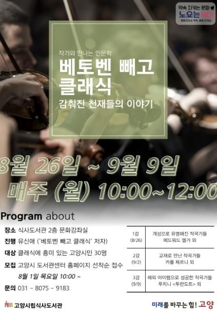 클래식에 관심이 있는 고양시민 30명을 대상으로 8월 26일부터 9월 9일, 매주 월요일 오전 10시부터 12시까지 총 3회 동안 식사도서관 2층 문화강좌실에서 진행된다.