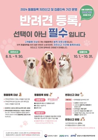 한편, 자진신고 기간 이후 10월 한 달간 반려견 출입이 많은 공원, 산책길 등을 중심으로 반려동물 미등록자, 정보변경 미신고자, 목줄 길이 2m 이내 유지 여부 등을 집중 단속할 예정이다.
