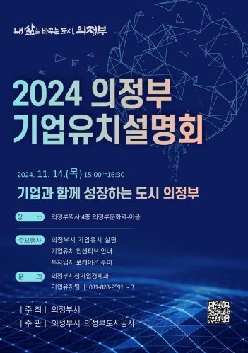 경기호연뉴스 민선기 기자 | 의정부시는 11월 14일 오후 3시에 의정부문화역 이음(의정부역사 4층)에서 첨단‧바이오 관련 기업 및 투자 관계자들을 대상으로 ‘2024 기업유치 설명회’를 개최한다.