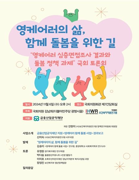 경기호연뉴스 민선기 기자 | 김남희 의원(더불어민주당,광명을), (사)보건복지자원연구원(이사장 백도명, 서울대학교 보건대학원 명예교수) 공동 주최하고, 금융산업공익재단이 지원하는 “영케어러(가족돌봄청년)의 삶, 함께 돌봄을 위한 길-영케어러 심층면접조사 결과와 돌봄정책 과제”국회 토론회가 11월 6일(수), 14시, 국회의원회관 제7간담회실에서 개최된다.