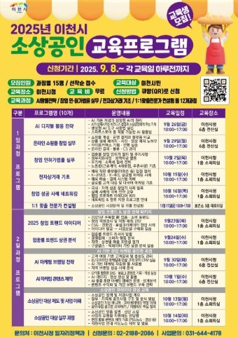 경기호연뉴스 민선기 기자 | 이천시는 예비 창업자와 초기 소상공인을 대상으로 한 ‘2025년 하반기 소상공인 교육프로그램’ 교육생을 모집한다.