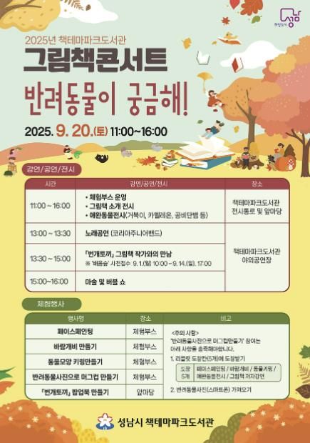 경기호연뉴스 민선기 기자 | 성남시는 오는 9월 20일 오전 11시~오후 4시 분당구 율동공원 내 책테마파크도서관에서 ‘반려동물이 궁금해!’ 주제로 한 그림책 콘서트를 연다.
