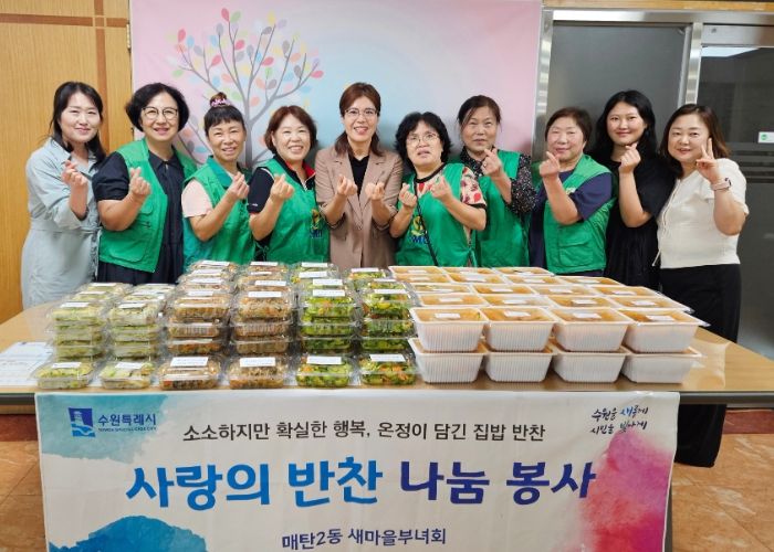 이날 매탄2동 새마을부녀회는 풍성한 나눔을 위해 잡채, 나박김치, 호박무침, 야채전 등 다양한 반찬들을 직접 만들어 관내 홀몸 어르신 등 지역사회 소외계층 30세대에 전달했다.