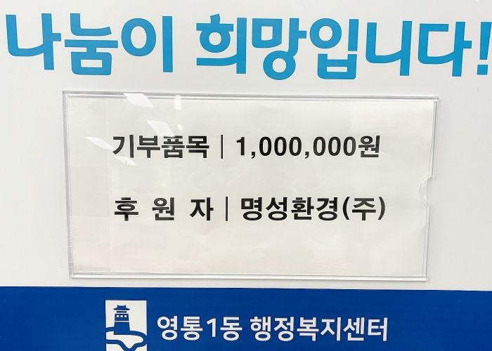 경기호연뉴스 민선기 기자 | 지난 17일, 명성환경(주)은 추석 명절을 맞이하여 어려운 이웃에게 전달해 달라며 성금 100만원을 경기사회복지공동모금회를 통해 영통1동에 기탁했다.