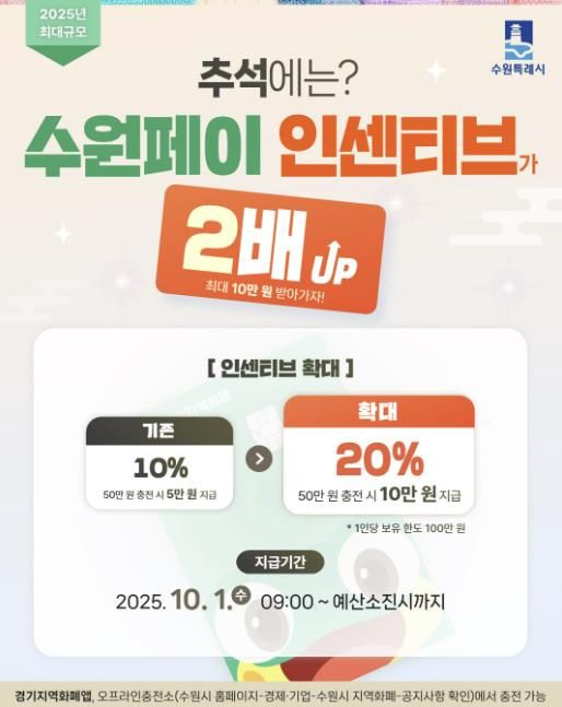 수원시 관계자는 “수원페이 인센티브 확대가 시민들의 경제적인 부담을 덜고, 지역경제를 활성화하는 데 도움이 되길 바란다”며 “추석 명절 연휴에 골목상권에서 소비가 늘어날 것으로 기대된다”고 말했다.