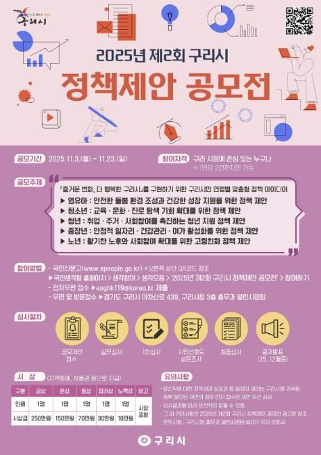 경기호연뉴스 민선기 기자 | 구리시는 오는 11월 3일부터 11월 23일까지'2025년 제2회 구리시 정책 제안 공모전'을 개최한다고 밝혔다. 이번 공모전의 주제는 ‘구리 시민(영유아·청소년·청년·중장년·노년) 나이별 맞춤형 정책 아이디어’다.