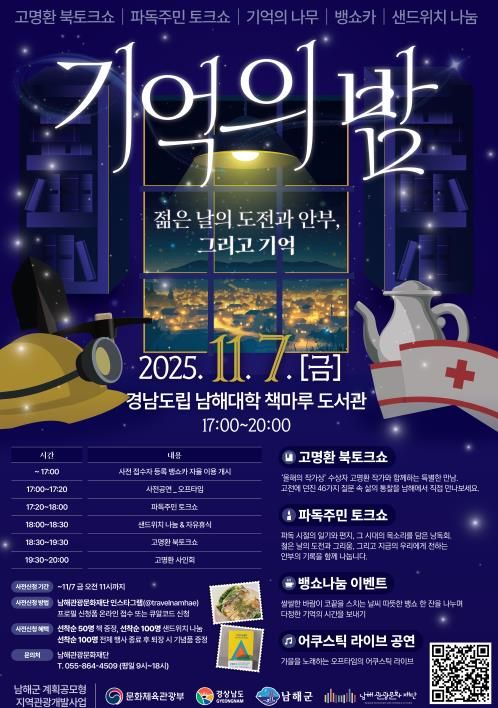 경기호연뉴스 민선기 기자 | ‘젊은 날의 도전과 안부, 그리고 기억’이라는 주제로 독일마을 기억의 밤 행사가 오는 11월 7일 17시부터 경남도립남해대학 책마루도서관에서 열린다.