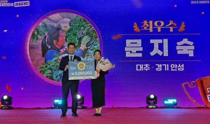 경기호연뉴스 민선기 기자 | 농림축산식품부 주최, 한국과수농협연합회 주관으로 하는 ‘2025 대한민국 과일산업대전 대표과일선발대회’에서 안성시가 2023년부터 대추부문에서 최우수상, 우수상을 수상하여 3년 연속 대추부문 최고자리에 올랐다. 수상자로 문지숙 대표가 최우수상(농림축산식품부장관상)으로 선정됐고, 조재곤 대표가 우수상(산림청장상)으로 선정됐다.