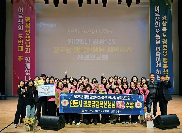 경기호연뉴스 민선기 기자 | 안동시와 (사)대한노인회 안동시지회는 12월 18일, 경상북도가 경북도청 동락관에서 개최한 ‘경로당 행복선생님 지원사업 2025년도 성과보고회’에서, 도내 22개 수행기관을 대상으로 한 사업평가 결과 ‘대상’을 수상하는 영예를 안았다.