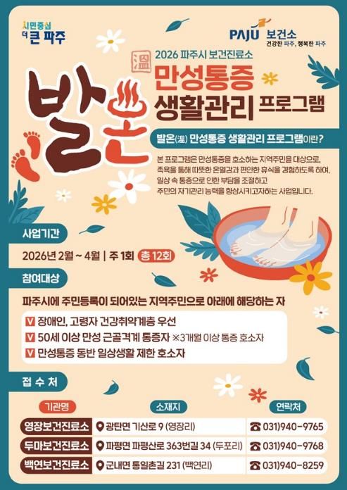경기호연뉴스 민선기 기자 | 파주시 보건진료소는 보건의료 취약지역 주민들의 건강증진을 위해 2026년 ‘발온(溫) 만성통증 생활관리’교실을 운영한다.