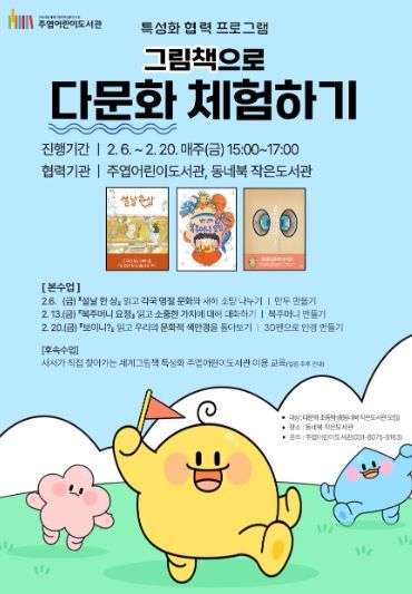 또한 이번 프로그램은 수업 종료 후 사서가 직접 동네북 작은도서관을 찾아가는 ‘도서관 이용 교육’으로 연계 운영될 예정이다. 세계그림책 특성화 주엽어린이도서관의 공간과 역할을 소개하고, 공공도서관 이용 방법을 쉽게 안내함으로써 다문화 어린이들이 공공도서관을 보다 친근하게 이해하고 지속적으로 이용할 수 있도록 지원한다.