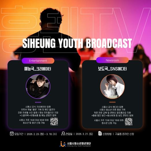 경기호연뉴스 민선기 기자 | 시흥시청소년청년재단은 시흥시 청소년ㆍ청년의 미디어 활동 역량을 강화하고, 재단의 소통 기능을 확대하기 위해 ‘흥텐TV’를 운영하는 가운데, ‘흥텐TV’를 함께 이끌어갈 예능국·보도국 신규 단원을 3월 18일까지 모집한다.