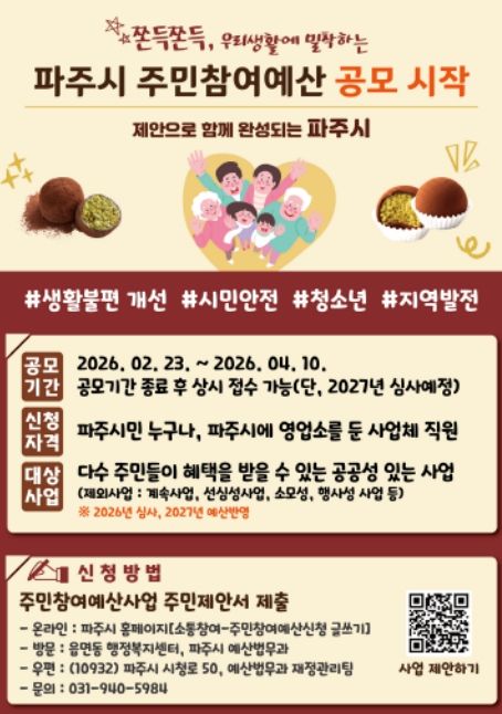 경기호연뉴스 민선기 기자 | 파주시는 2027년도 예산 편성에 반영할 주민참여예산 시민 제안을 오는 4월 10일까지 접수한다.