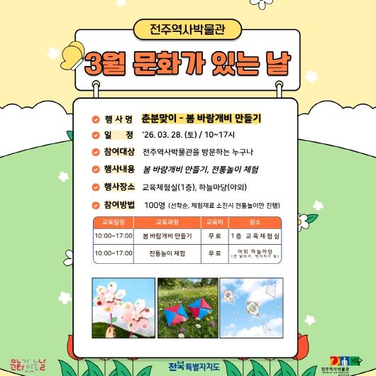 전주역사박물관 관계자는 “이번 춘분맞이 행사가 봄의 따뜻한 기운 속에서 온 가족이 함께 즐기는 소중한 시간이 되길 바란다”면서 “앞으로도 매달 다양한 문화 체험의 기회를 드릴 수 있도록 알찬 프로그램을 준비하겠다”고 말했다.