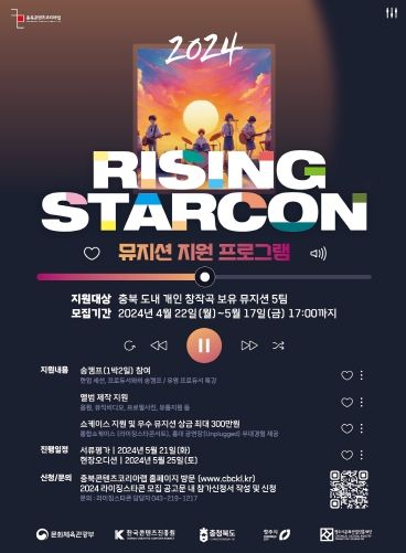청주시가 주관하고 청주시문화산업진흥재단이 운영하는 충북콘텐츠코리아랩이 오는 5월 17일 오후 5시까지 ‘2024 라이징스타콘’에 참여할 도내 뮤지션을 모집한다.