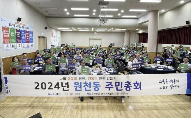 경기호연뉴스 민선기 기자 | 수원시 영통구 원천동 주민자치회는 지난 18일 동 행정복지센터 3층 다목적실에서 지역주민 100여 명이 참여한 가운데 ‘2024년도 원천동 주민총회’를 개최했다.