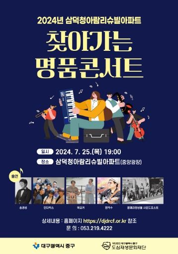 경기호연뉴스 민선기 기자 | 대구 중구와 중구 도심재생문화재단은 오는 25일 삼덕청아람리슈빌아파트에서 ‘찾아가는 명품콘서트’를 개최한다.