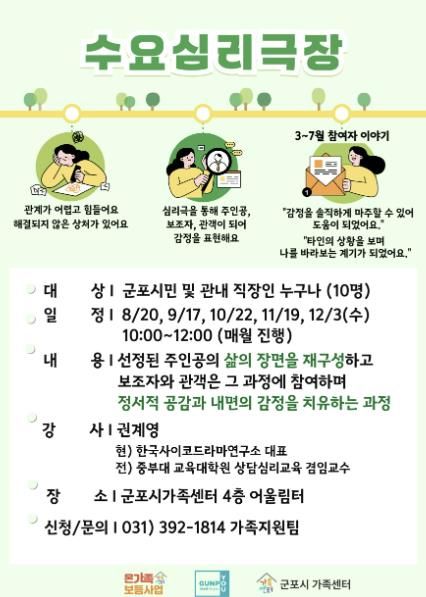 경기호연뉴스 민선기 기자 | 군포시가족센터는 매월 셋째 주 수요일, 심리적 갈등과 대인관계 문제 해결을 돕는 집단심리치료 프로그램 ‘수요심리극장’을 운영하고 있다.