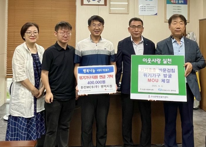 강성식 오성면장은 “이번 협약이 지역사회에 따뜻한 나눔과 상생 협력이 확산되는 계기가 되길 기대한다”라며, “함께 힘을 보태주신 한전 MCS 평택지점에 깊이 감사드리며, 앞으로도 행정복지센터가 든든한 지원체계로서 역할을 다하겠다”라고 전했다.