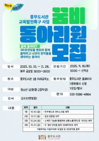 참여 신청은 9월 16일 오전 10시부터 풍무도서관 홈페이지에서 가능하며, 중고등학생 12명을 선착순으로 모집한다.