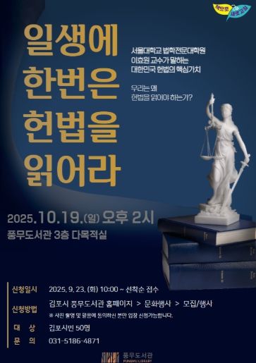 경기호연뉴스 민선기 기자 | 김포시 풍무도서관에서는 시민 교양 인문강좌의 일환으로 ‘일생에 한번은 헌법을 읽어라’를 오는 10월 19일 오후 2시부터 4시까지 운영한다.