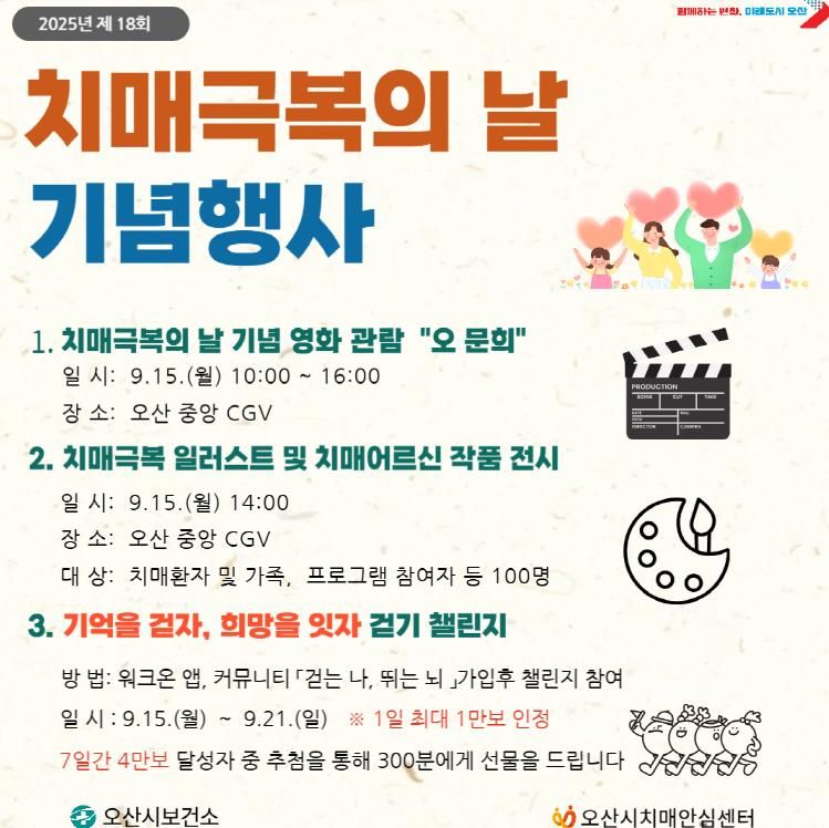 이번 기념행사에는 ▲오산 중앙 CGV에서의 치매 관련 영화 관람 ▲모바일 걷기 앱 ‘워크온’을 활용한 걷기 챌린지 ▲치매 예방수칙 3.3.3 실천 다짐 판넬 투표 등 다양한 프로그램이 마련되어 시민들의 참여를 기다리고 있다.