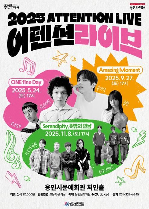 〈어텐션 라이브〉는 2021년부터 이어져 온 용인문화재단의 청년 지원 콘텐츠로, 매 공연 새로운 라인업과 실험적 시도를 통해 관객의 큰 호응을 얻으며 매진을 기록해왔다. 올해 세 번째 무대는 ‘뜻밖의 만남(Serendipity)’이라는 주제 아래, 개성 있는 두 밴드가 함께 특별한 음악적 교감을 선사한다.