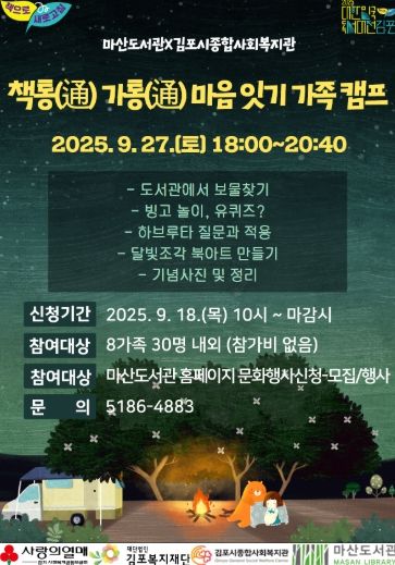 경기호연뉴스 민선기 기자 | 김포시 마산도서관에서 오는 9월 27일 오후 6시부터 ‘책통(通) 가통(通) 마음 잇기 가족 캠프’를 운영한다.