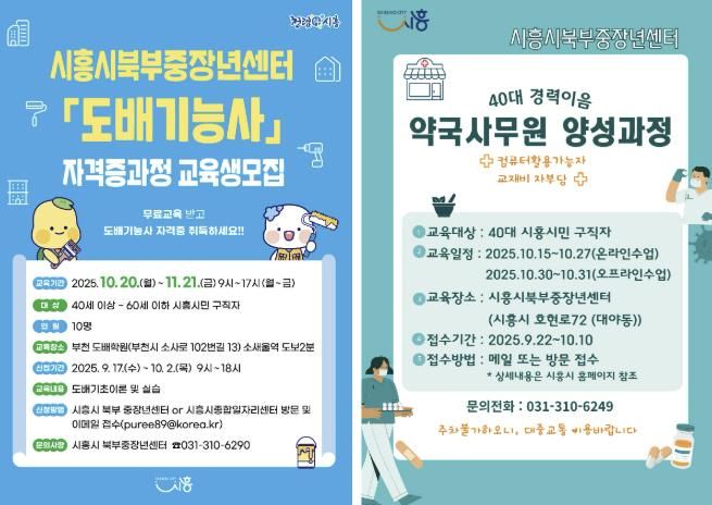 특히 10월에는 도배기능사 자격증 과정과 약국 사무원 양성 과정을 개설해 참여자를 모집하며, 참여 신청은 9월 17일부터 10월 2일까지 시흥시북부중장년센터(시흥시 호현로 72)에 방문하거나 전자우편을 통해서도 가능하다. 교육별 장소 및 기간이 다르므로 교육 관련 자세한 사항은 시흥시청 누리집의 고시공고 게시판에서 확인하면 된다.