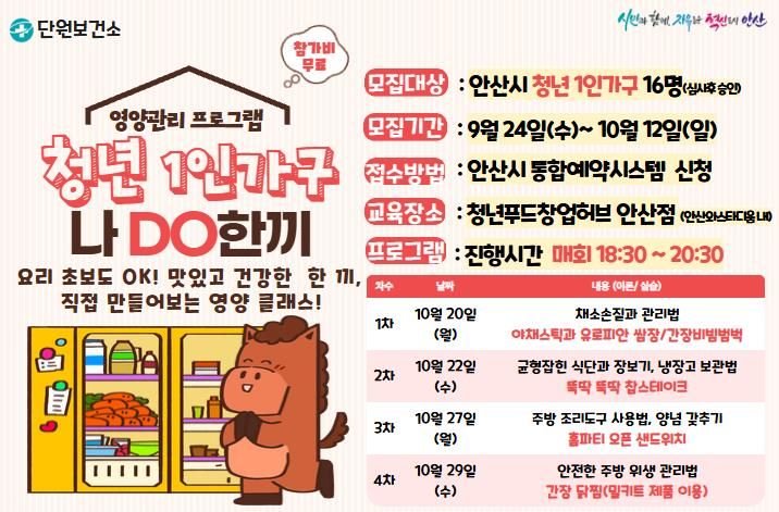 경기호연뉴스 민선기 기자 | 안산시 단원보건소는 오는 24일부터 청년 1인가구 영양관리 프로그램 ‘나DO한끼’ 참여자를 모집한다고 23일 밝혔다.