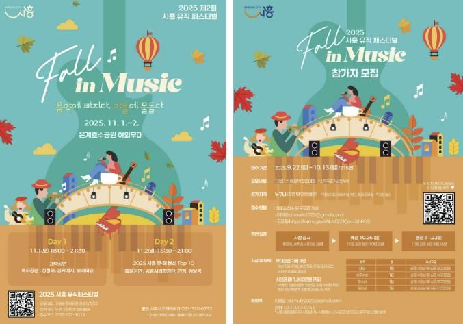 경기호연뉴스 민선기 기자 | 시흥시는 오는 11월 1일부터 2일까지 시흥 은계호수공원에서 ‘2025년 제2회 시흥뮤직페스티벌’ 개최를 앞두고 참가팀을 모집한다. 올해 페스티벌 주제는 ‘시흥 Fall in Music -음악에 빠지다, 가을에 물들다- ’로 ‘가을’을 주제로 한 다양한 장르의 전국 단위 음악경연대회 및 축하공연으로 꾸며진다.