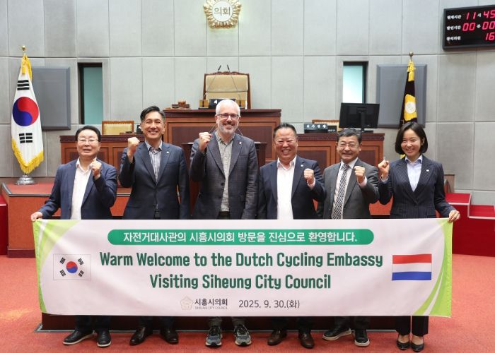 경기호연뉴스 민선기 기자 | 시흥시의회 도시환경위원회가 9월 30일 의회청사 소담뜰에서 네덜란드 자전거대사관(Dutch Cycling Embassy, DCE)을 초청해 간담회를 열고, 시흥시 자전거 정책 발전 방향과 친환경 교통 시스템 구축 방안에 대해 논의했다.