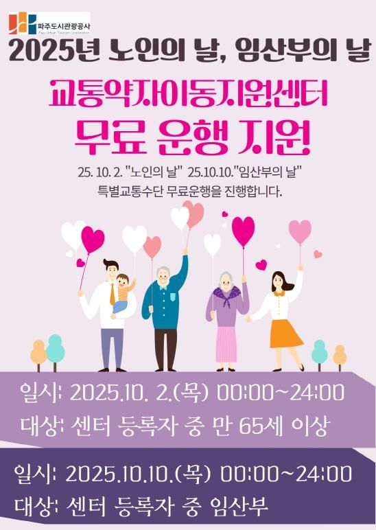 경기호연뉴스 민선기 기자 | 파주도시관광공사 교통약자이동지원센터는 10월 2일 “노인의 날”과 10월 10일 “임산부의 날”을 맞이하여 특별교통수단 무료 운행 서비스를 진행한다고 밝혔다.