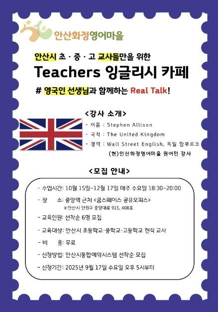 경기호연뉴스 민선기 기자 | 안산시 안산화정영어마을은 오는 15일부터 12월 17일까지 관내 소속 교사를 대상으로 ‘티처스(Teachers) 잉글리시 카페’를 운영한다고 10일 밝혔다.