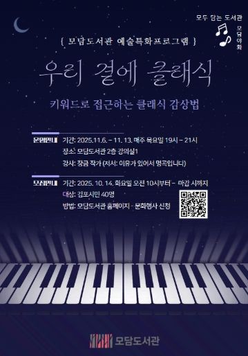 경기호연뉴스 민선기 기자 | 김포시 모담도서관은 클래식을 주제로 11월 6일부터 13일까지 매주 목요일 오후 7시부터 9시까지 특별 강연을 운영한다.