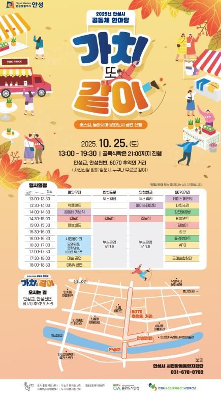 경기호연뉴스 민선기 기자 | 안성시는 오는 2025년 10월 25일, 안성시내 일원(안성교~안성천변~안성천~6070 추억의거리)에서 2025 안성시 공동체 한마당 ‘가치 또 같이’ 를 개최한다.