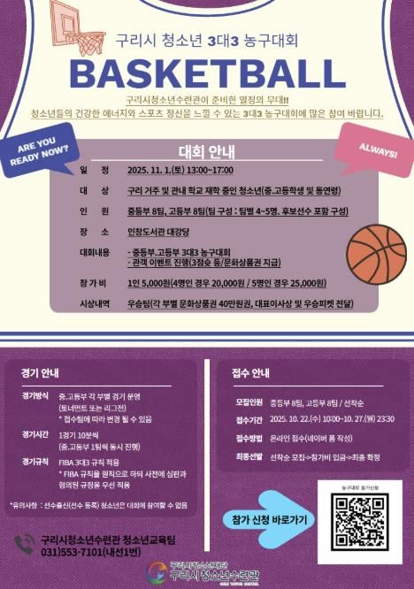 경기호연뉴스 민선기 기자 | 구리시청소년재단 청소년수련관은 '2025 구리시 청소년 3대3 농구대회' 참가 신청을 10월 22일부터 10월 27일까지 온라인으로 신청받는다고 밝혔다.