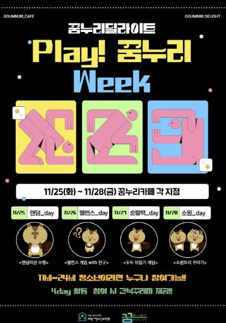 경기호연뉴스 민선기 기자 | 의왕시청소년재단 산하 의왕시청소년수련관 꿈누리카페(▲고천점( 문화공원로 33), ▲내손점(복지로 109), ▲오전점(찬우물길 11), ▲백운밸리점(백운중앙로 74, 총 4개 지점))는 오는 11월 25일부터 28일까지 4일간 꿈누리딜라이트 『Play! 꿈누리 Week』를 진행한다고 밝혔다.