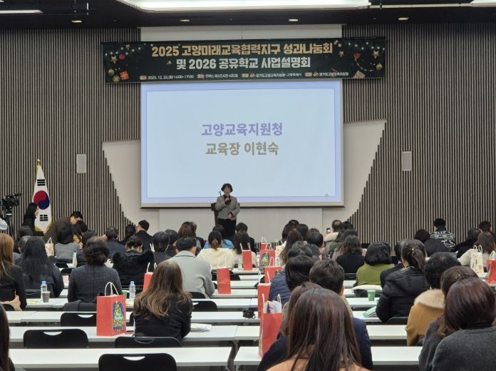 경기호연뉴스 민선기 기자 | 경기도고양교육지원청은 2025년 12월 23일 킨텍스 제2전시장(401~403호)에서‘2025 고양미래교육협력지구 성과나눔회 및 2026 공유학교 사업설명회’를 개최했다. 이날 행사에는 고양 관내 유·초·중·고 교사, 학교관리자, 학생, 협력 마을활동가 등 총 400여 명이 참석해 고양교육의 미래를 함께 모색했다.
