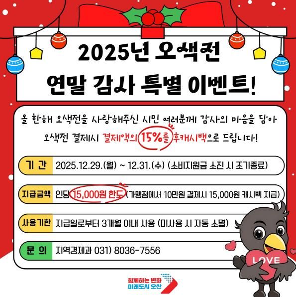 경기호연뉴스 민선기 기자 | 오산시는 한 해 동안 지역화폐를 이용해 준 시민들에게 감사의 뜻을 전하고, 연말 소비 활성화를 도모하기 위해 ‘2025년 오색전 연말 감사 특별 이벤트’를 추진한다.
