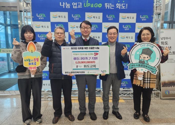 이번 후원금은 크리스마스를 맞아 지역 아동들에게 따뜻한 선물과 희망을 전하고자 화도교회 신도들이 십시일반 정성을 모은 천사구제헌금으로, 관내 중증장애인 부모 가정과 조손가정 아동 20명의 꿈과 희망을 응원하는데 지원된다.