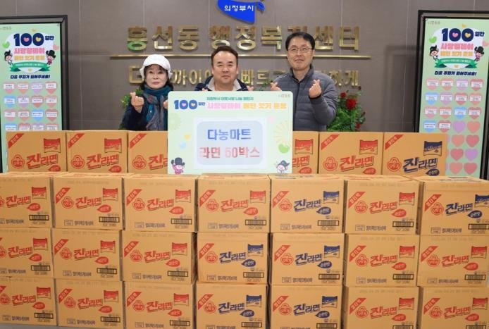경기호연뉴스 민선기 기자 | 의정부시 흥선동행정복지센터는 12월 24일 다농마트가 ‘100일간 사랑릴레이 배턴 잇기’에 동참해 라면 50상자를 기탁했다고 밝혔다.