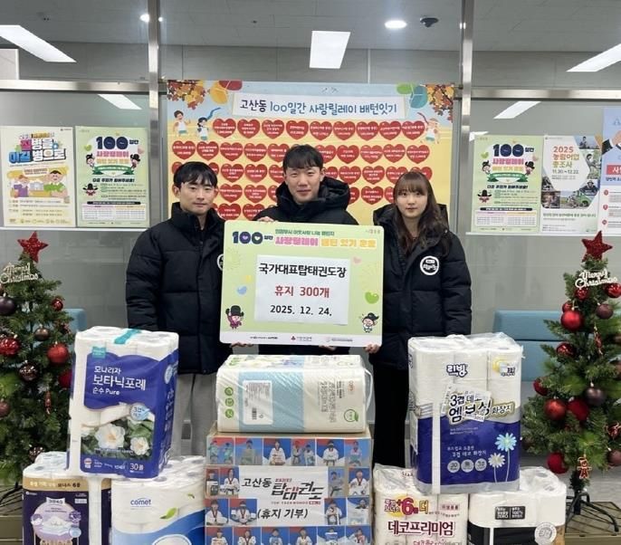 경기호연뉴스 민선기 기자 | 의정부시 고산동주민센터는 12월 24일 고산동 소재 국가대표 탑 태권도장이 지역 저소득층을 위해 두루마리 화장지 300개를 기부했다고 밝혔다.