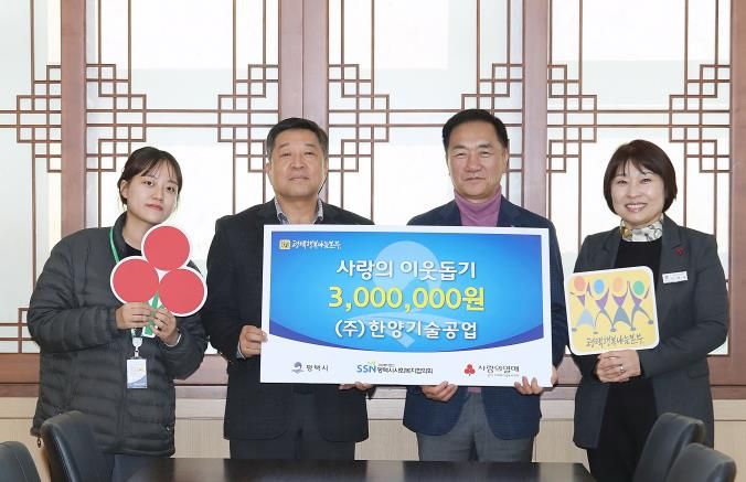 이에 정장선 평택시장은 “우리 사회 어려운 분들을 생각하며 후원하신 ㈜한양기술공업에 감사드린다”며 “지역사회 나눔 실천에 진심으로 감사드린다”고 전했다.