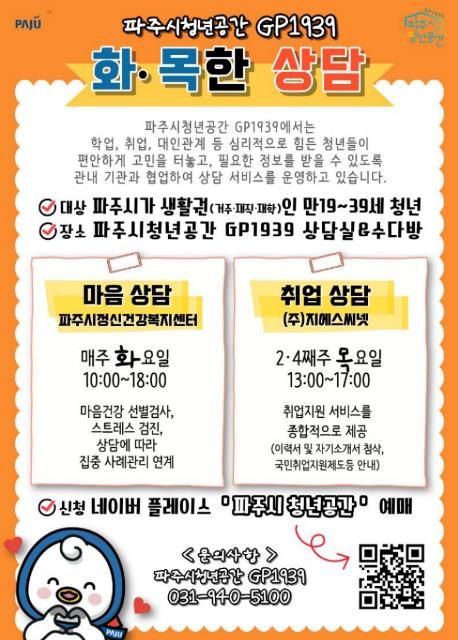경기호연뉴스 민선기 기자 | 파주시는 청년들의 심리 안정과 취업 역량 강화를 위해 파주시청년공간 지피(GP)1939에서 진행하는 상담 프로그램 ‘화·목한 상담’의 참여자를 모집한다.