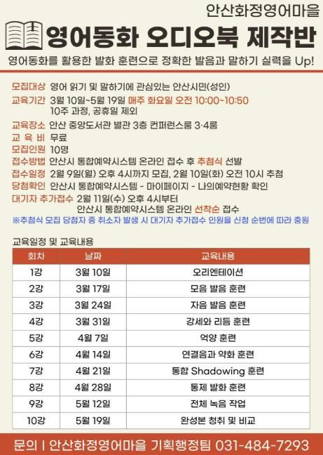 경기호연뉴스 민선기 기자 | 안산시가 설립하고 안산대학교가 운영하는 안산화정영어마을이 성인 영어 학습자를 위한 ‘영어동화 오디오북 제작반’을 3월부터 5월까지 10주 과정으로 안산시 중앙도서관에서 운영한다고 4일 밝혔다.