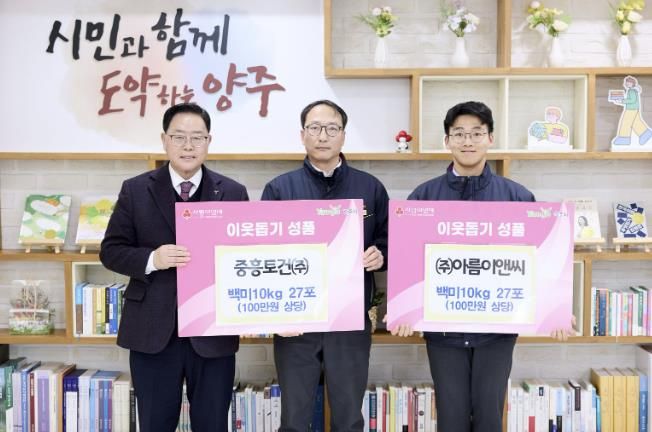경기호연뉴스 민선기 기자 | 양주시가 지난 3일 시장실에서 중흥토건㈜과 ㈜아름이앤씨로부터 이웃돕기 성품으로 백미 10kg 54포(200만 원 상당)를 기탁받았다.
