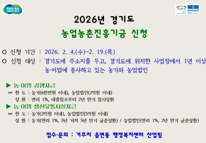 경기호연뉴스 민선기 기자 | 이천시는 농업인에게 장기·저리 융자 지원을 실시하고 경영안정을 돕기 위해 2026년 경기도 농업농촌진흥기금 농어업 경영자금, 농어업 생산유통시설자금 사업에 대한 신청을 2월 3일부터 접수한다.