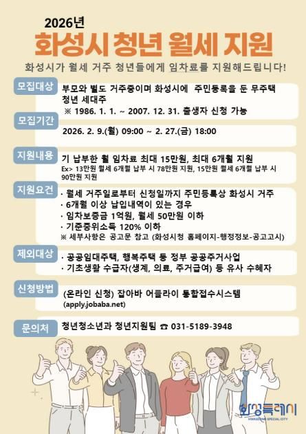 경기호연뉴스 민선기 기자 | 화성특례시가 청년들의 주거비 부담을 덜고 안정적인 주거 생활을 지원하기 위해 2월 9일부터 2월 27일까지‘청년 월세 지원 사업’ 신청자를 모집한다고 밝혔다.