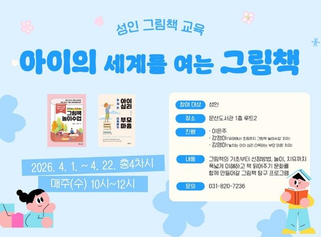 경기호연뉴스 민선기 기자 | 파주시 문산도서관은 그림책의 가치와 활용 방법을 이해하고, 지역사회에 책 읽어주기 문화를 확산하기 위한 그림책 교육 프로그램 ‘아이의 세계를 여는 그림책’을 오는 4월 1일부터 4월 22일까지 운영한다.